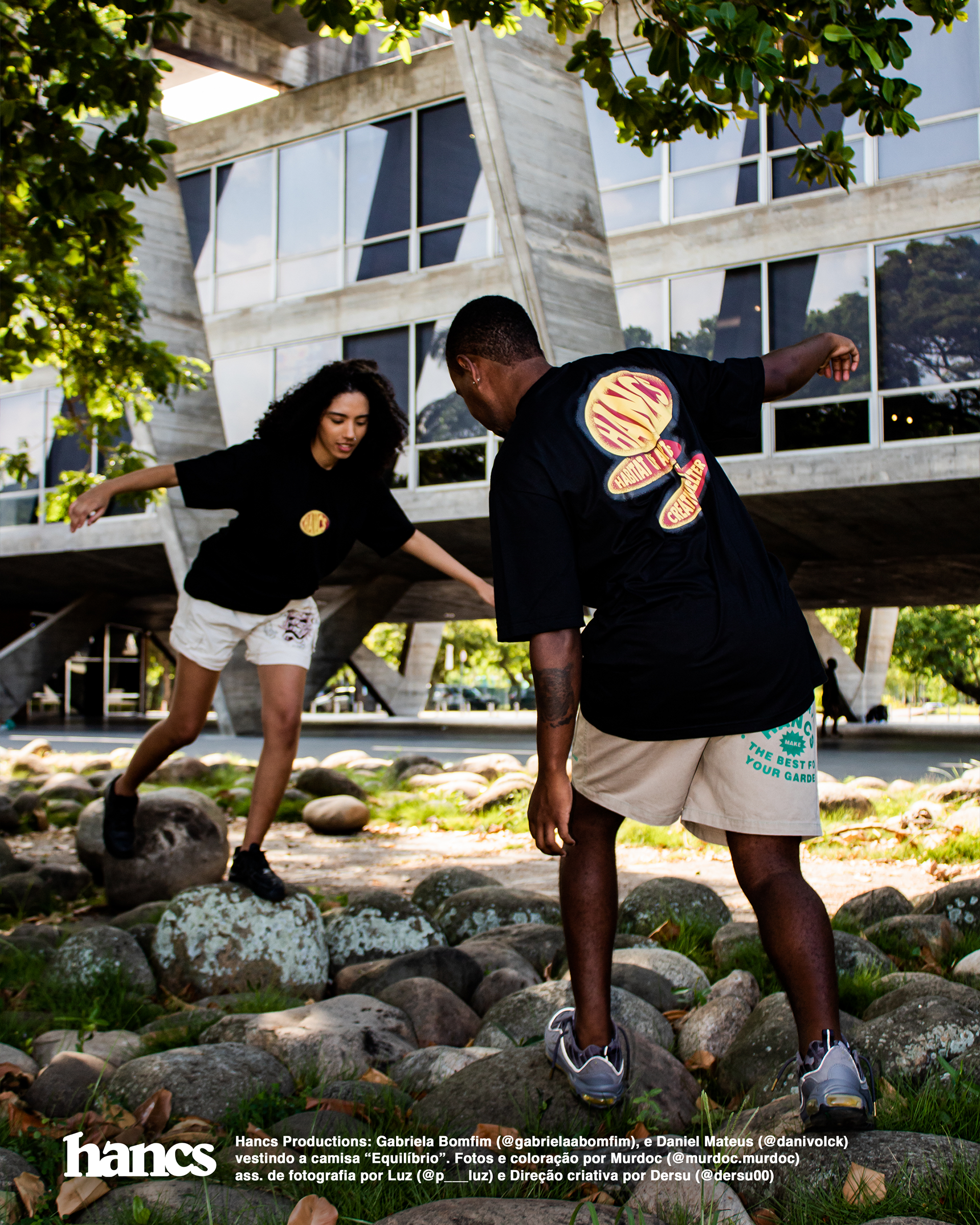 Neste projeto autoral para a Hancs, o objetivo foi traduzir a ideia de equilíbrio de forma subjetiva, evitando uma ilustração literal. Desenvolvi a estampa e a narrativa visual da camiseta, além de dirigir a proposta fotográfica, partindo de um moodboard de referências que orientou a construção da linguagem do projeto.